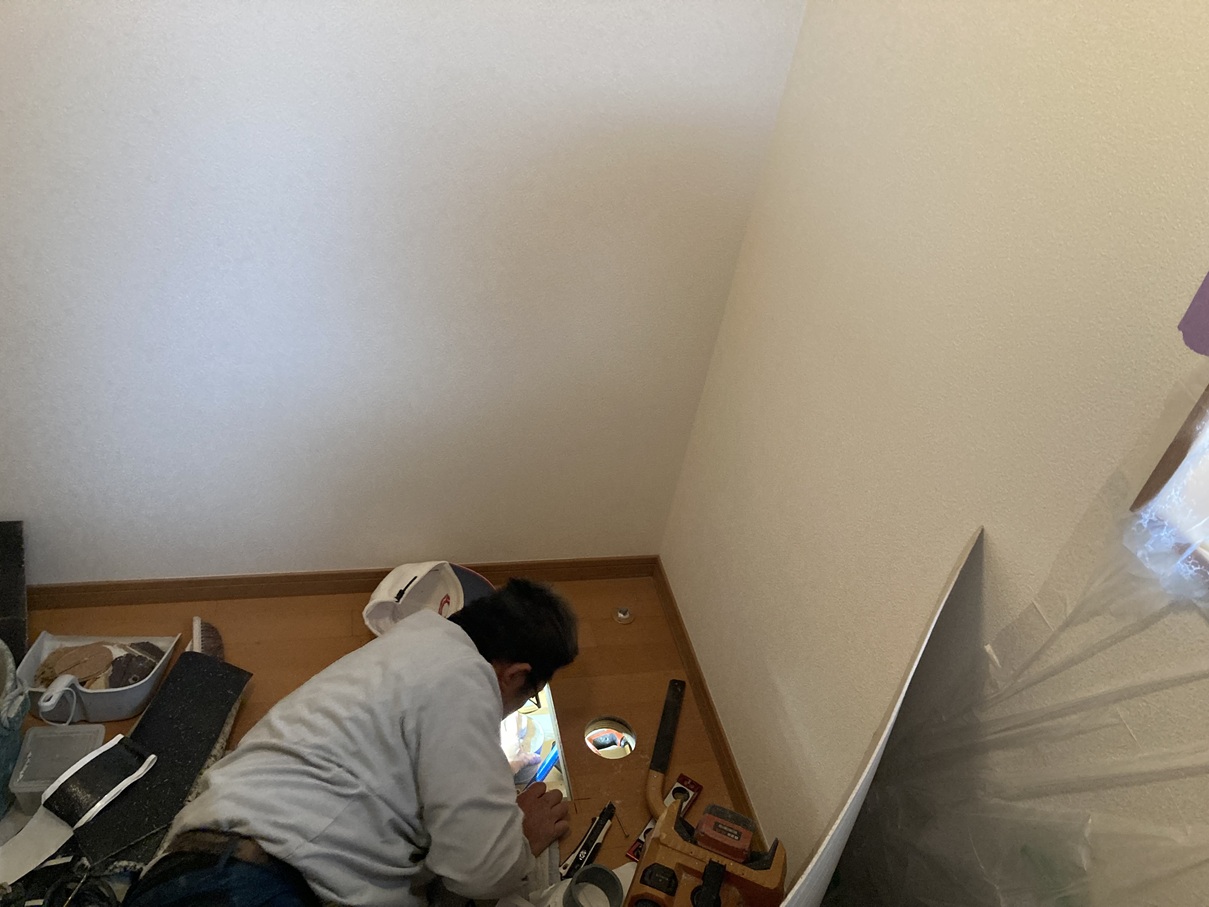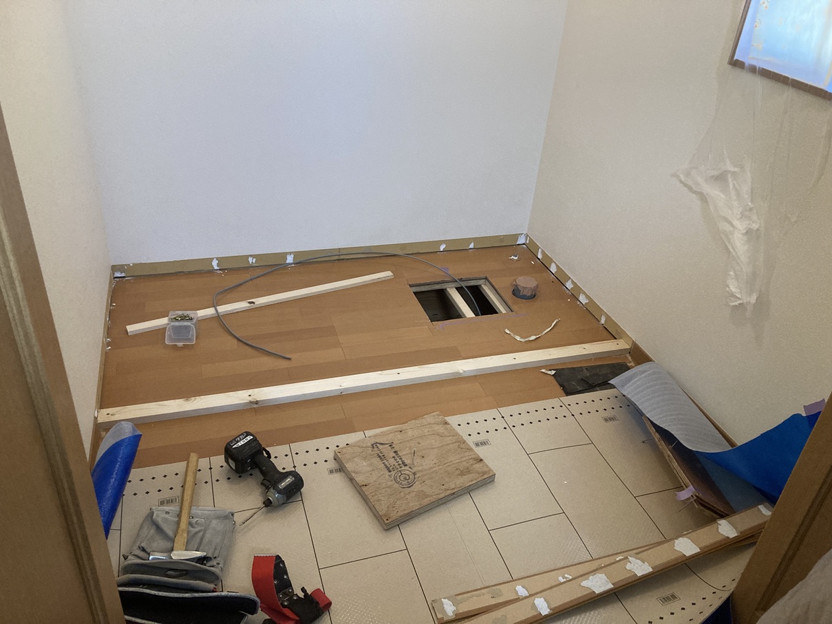 トイレ空間を確保するため、間仕切り壁を設ける前の準備を行っています。