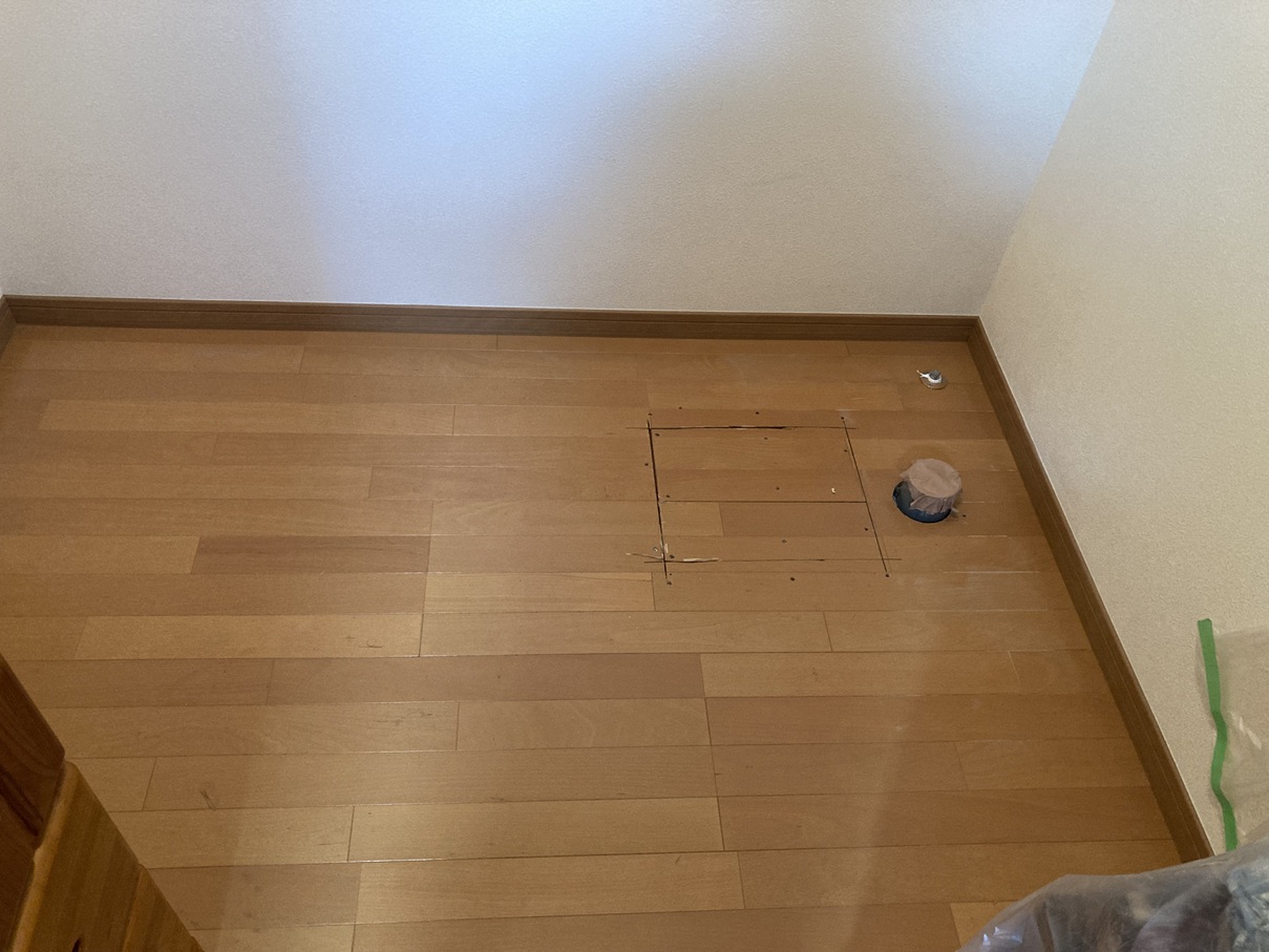 既存の床を開口し、トイレ設置に必要な配管スペースを確保していきます。