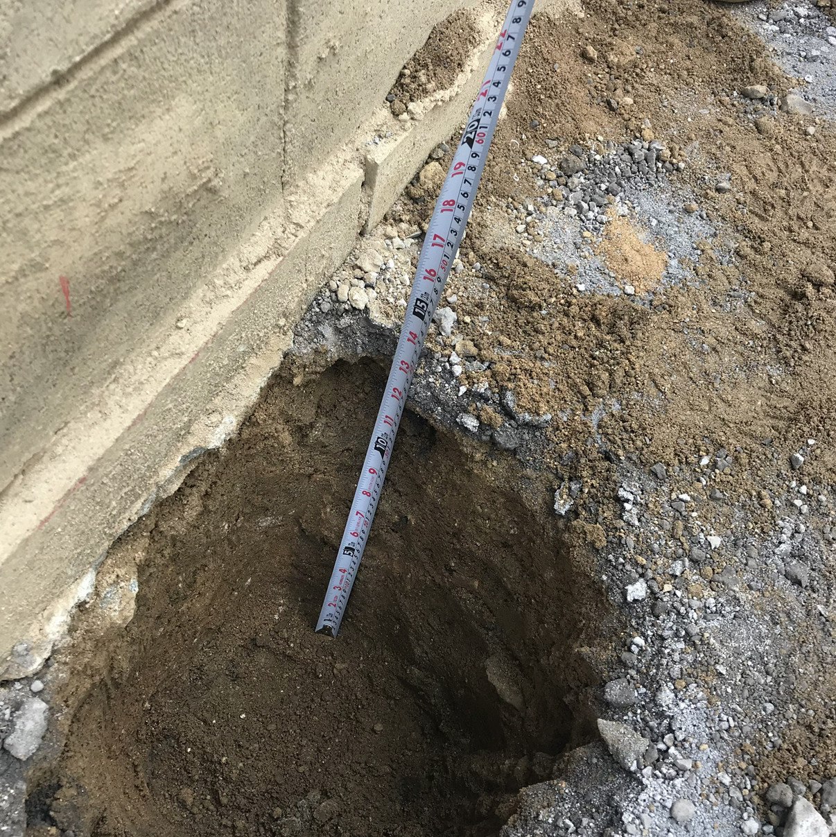 写真②で整えた下地部分に、柱位置を決めて掘削を行っています。