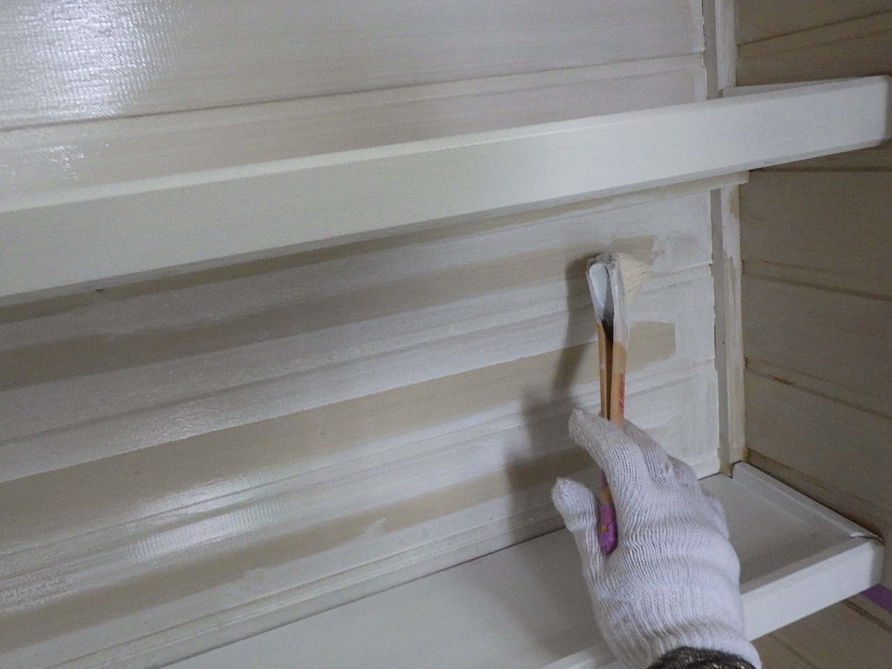 棚の立ち上がり部分や、壁との取り合いなど、ローラーでは塗りにくい細かな箇所を刷毛で丁寧に塗装していきます。