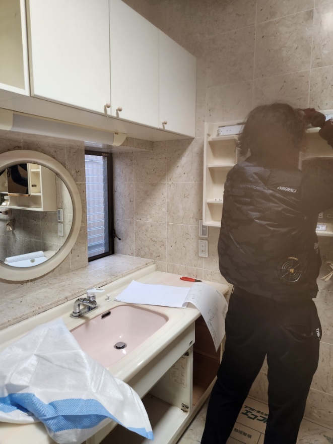 既存の洗面化粧台やミラー収納を丁寧に取り外し、新しい設備を設置するための下準備を行っています。