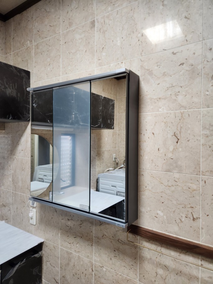 新しく設置したミラーキャビネットは、スタイリッシュなブラックフレームタイプ。