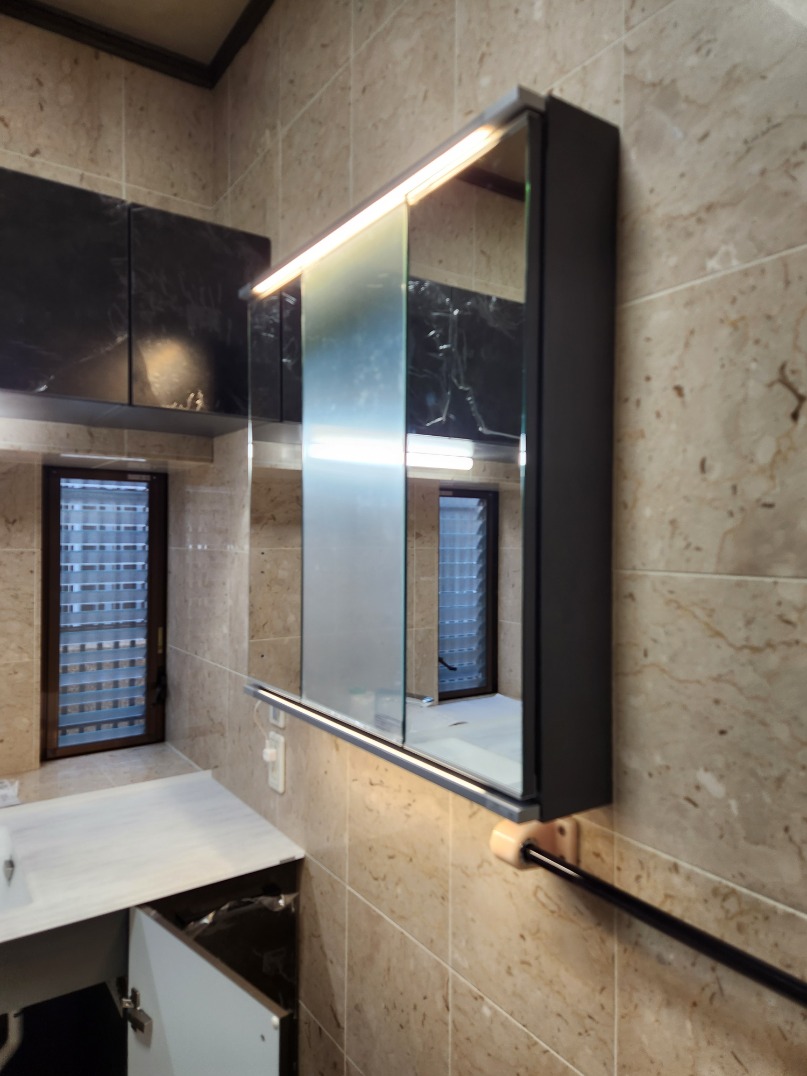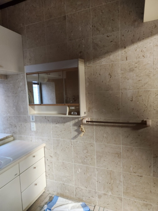 before 鏡収納も、経年劣化による色あせが見られます。タイル壁に合わせた落ち着いた雰囲気ですが、少し古さを感じる印象でした。