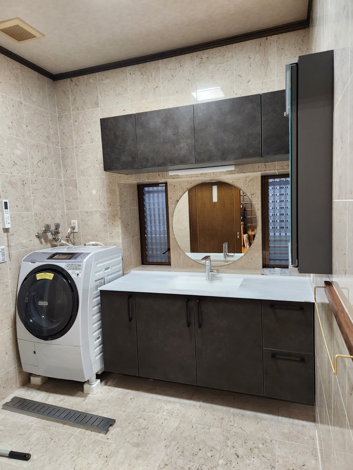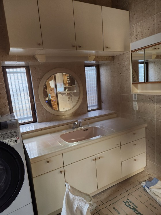 before リフォーム前の洗面所の様子です。 収納が多く、しっかりとした造りの洗面化粧台ですが、経年による汚れや黄ばみが見られます。