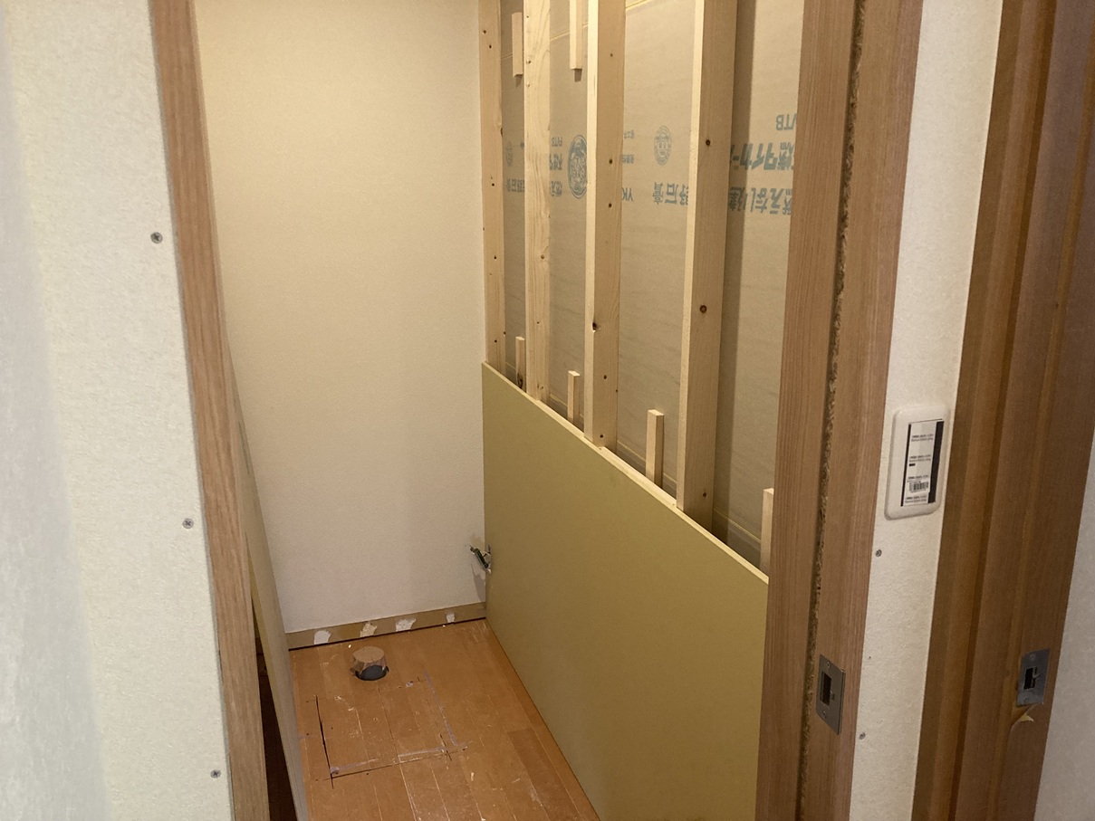 石膏ボードを貼り、空間の形がはっきりしてきました。 トイレとしてのイメージが見えてくる段階です。