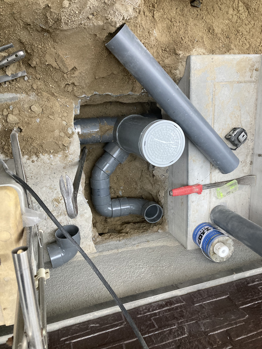 トイレ設置に必要な給排水の配管を施工。 見えない部分ですが、重要な工程になります。