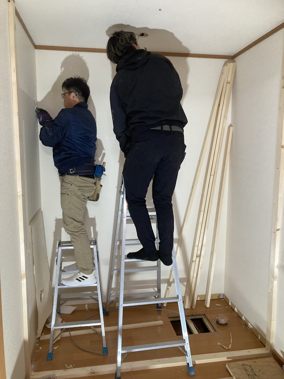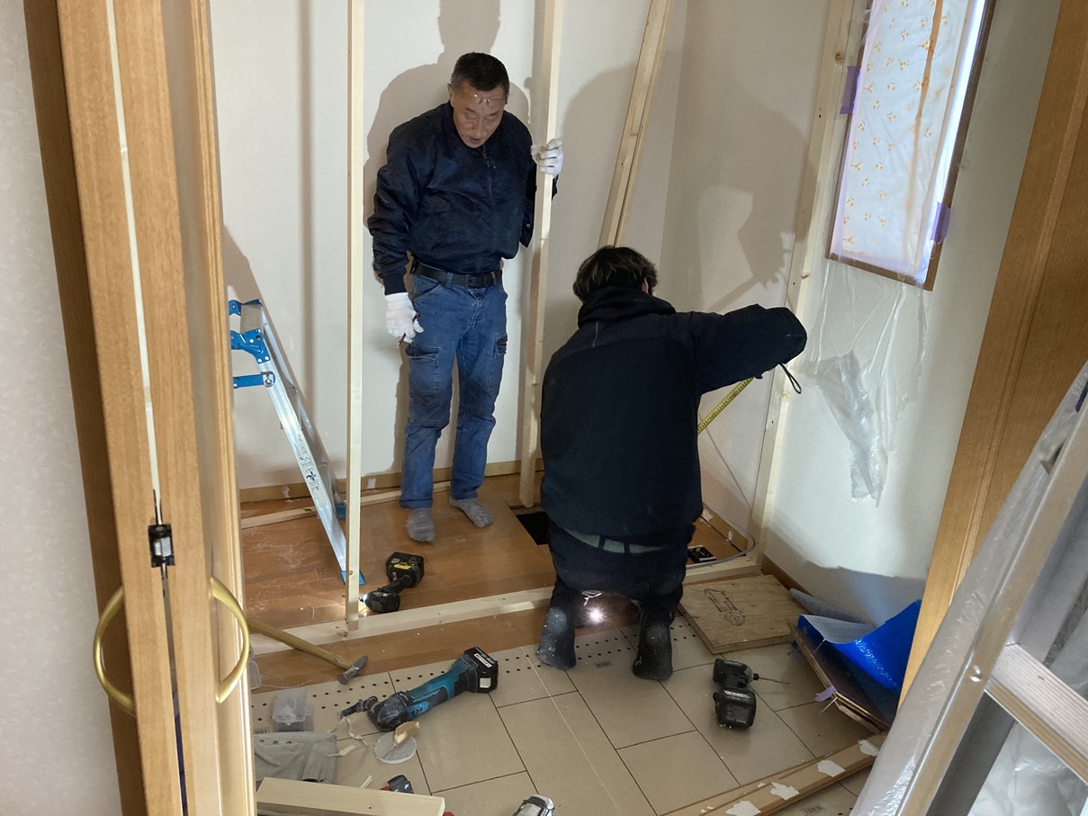 トイレ空間を仕切るための壁の骨組みを施工。 位置や寸法を調整しながら丁寧に組み上げます。