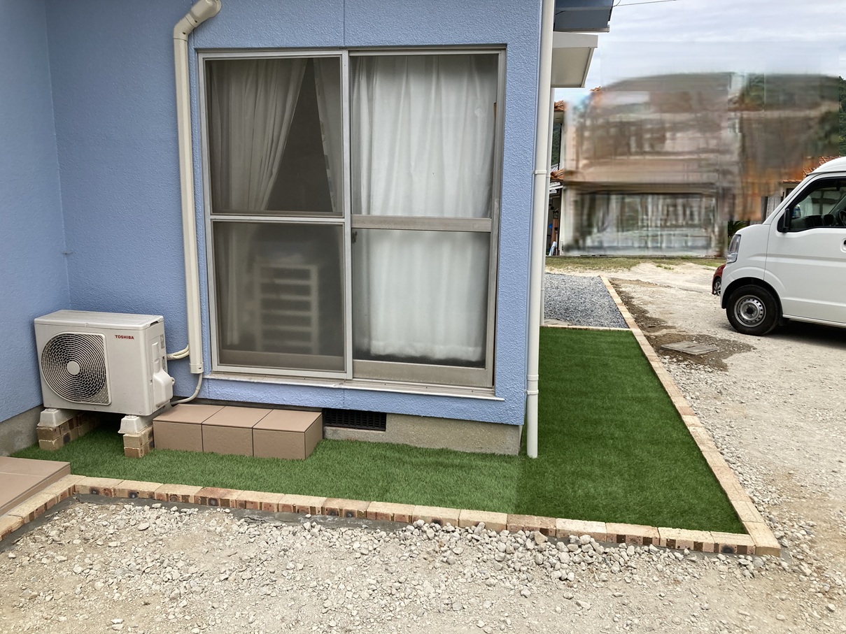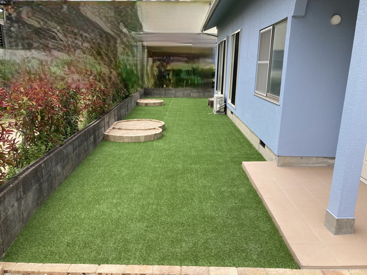 after 人工芝が敷かれ、明るく清潔感のある庭に生まれ変わりました✨ 雑草の心配も少なくなり、お手入れの負担も軽減されています。