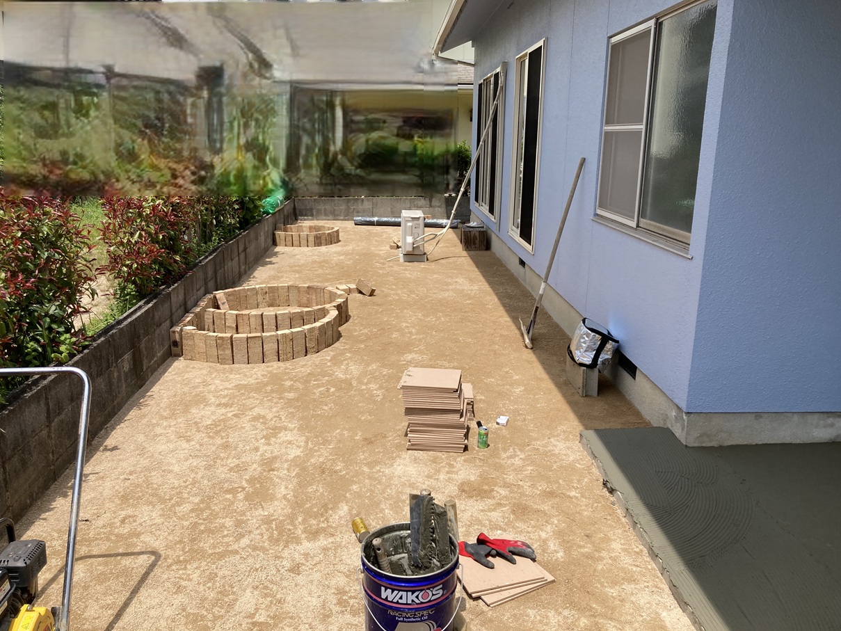 雑草や既存のタイルを撤去し、下地を整えます。転圧作業を行い、しっかりと締め固めることで、仕上がり後の沈み込みを防ぎます。