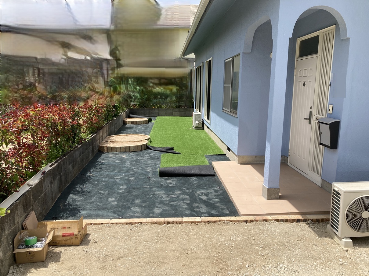 整地後、防草シートを丁寧に敷き込みます。その上から人工芝を敷設し、いよいよ完成が見えてきました🌿