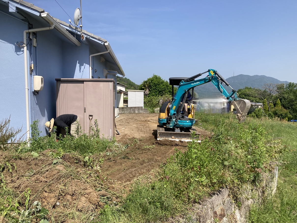 重機を使って、雑草や不要な土を撤去しながら整地作業を進めています。