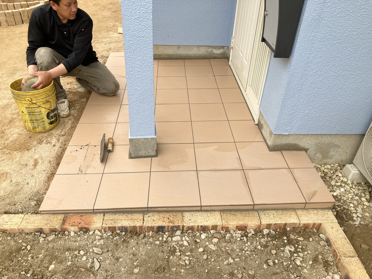玄関ポーチ前は、新しくタイルを施工しました。 水平・高さを丁寧に調整しながら、一枚一枚貼り進めています。