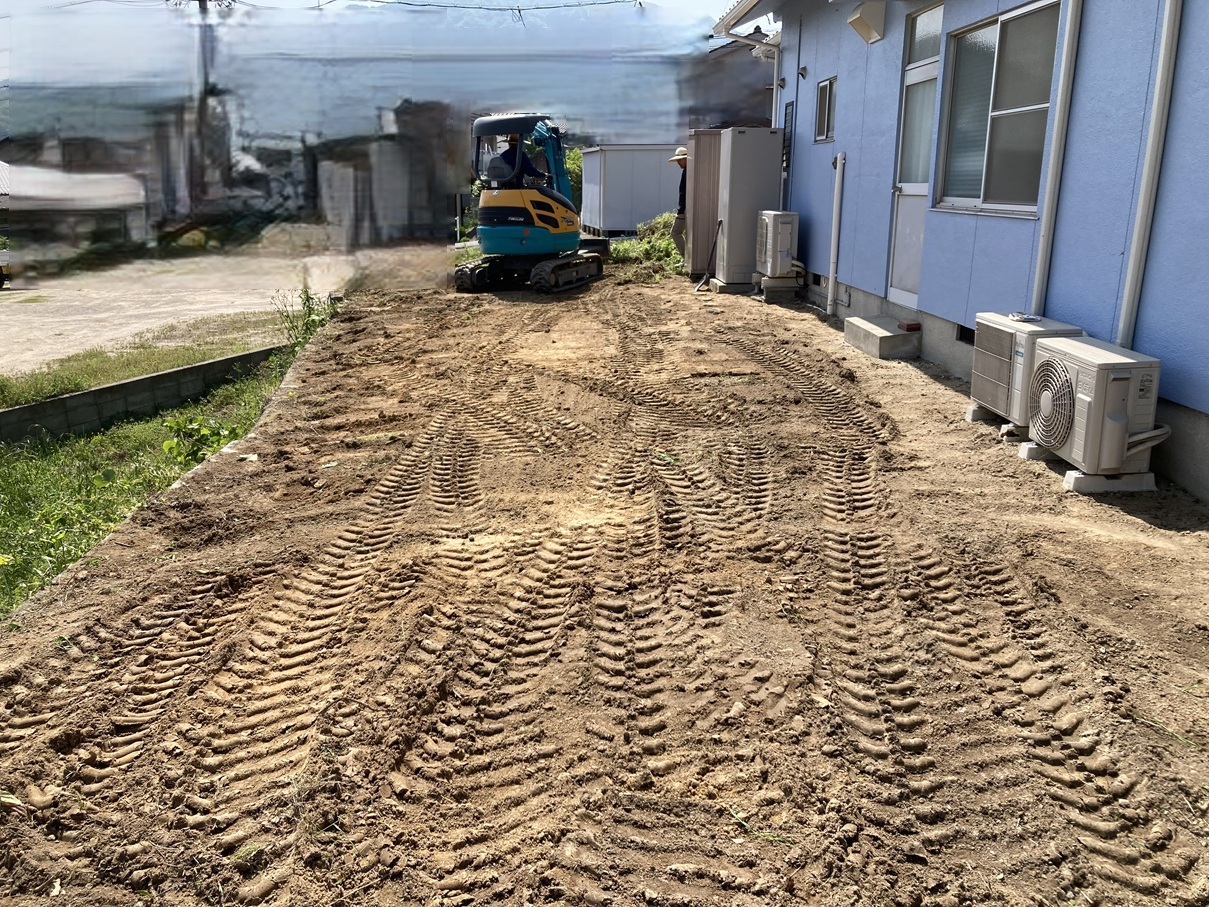 重機を使って、雑草や不要な土を撤去しながら整地作業を進めています🚜高低差や地面の凹凸を調整し、しっかりと整地を行います。