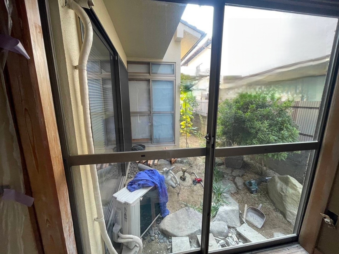 庭に出入りできる縦長の掃き出し窓が設置されていました。 今回はこの窓を撤去し、窓サイズを変更して断熱性を高めるリフォームを行います