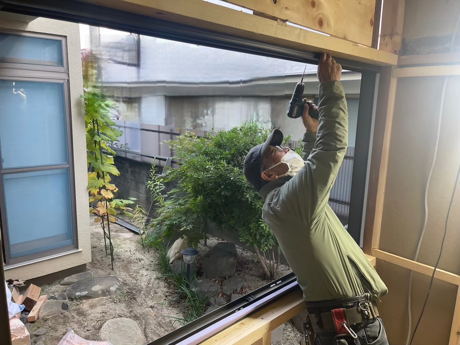既存の窓を撤去し、新しい窓を取り付けるための下地を施工しています。 窓の下半分は壁にするため、木下地を組んで開口サイズを調整します。