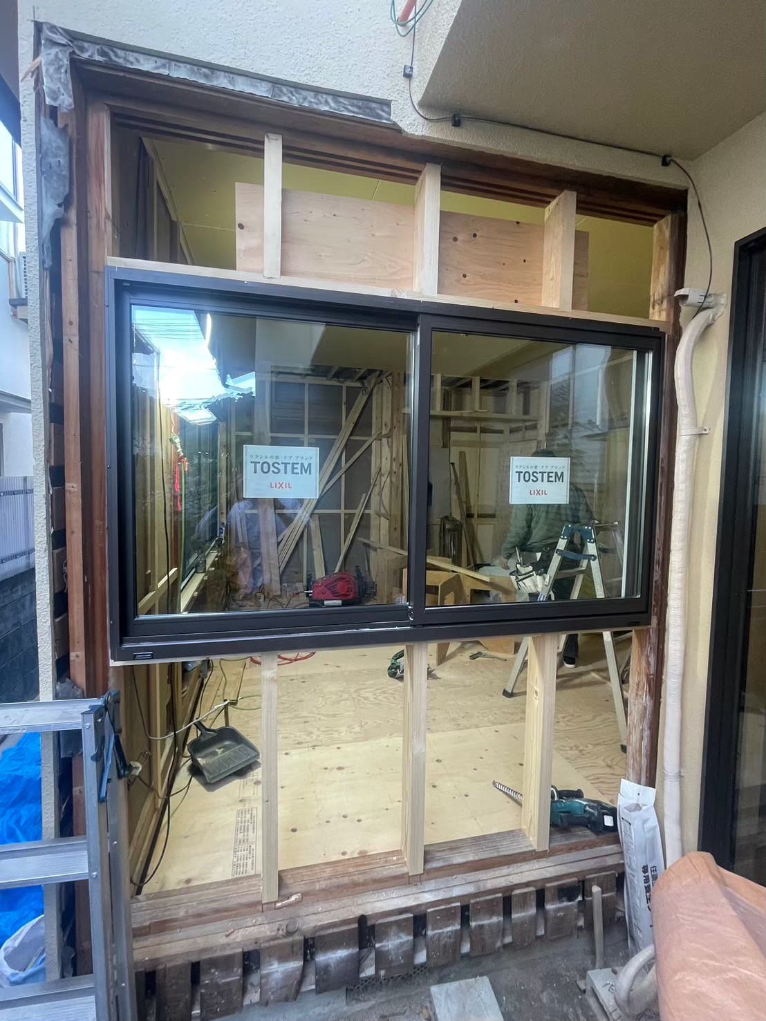 新しい窓枠を設置し、アルミ樹脂複合サッシ サーモスL(LIXIL) を取り付けています。 断熱性能を高めるため、水平や位置を確認しながら丁寧に施工します。