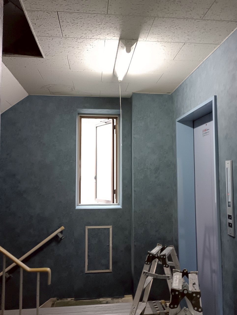 before クロスは剥いでありますが、入り口付近のため、雨による湿気や、手すりを持つ手で汚れがつきやすく、カビなどの汚れが目立ちます。