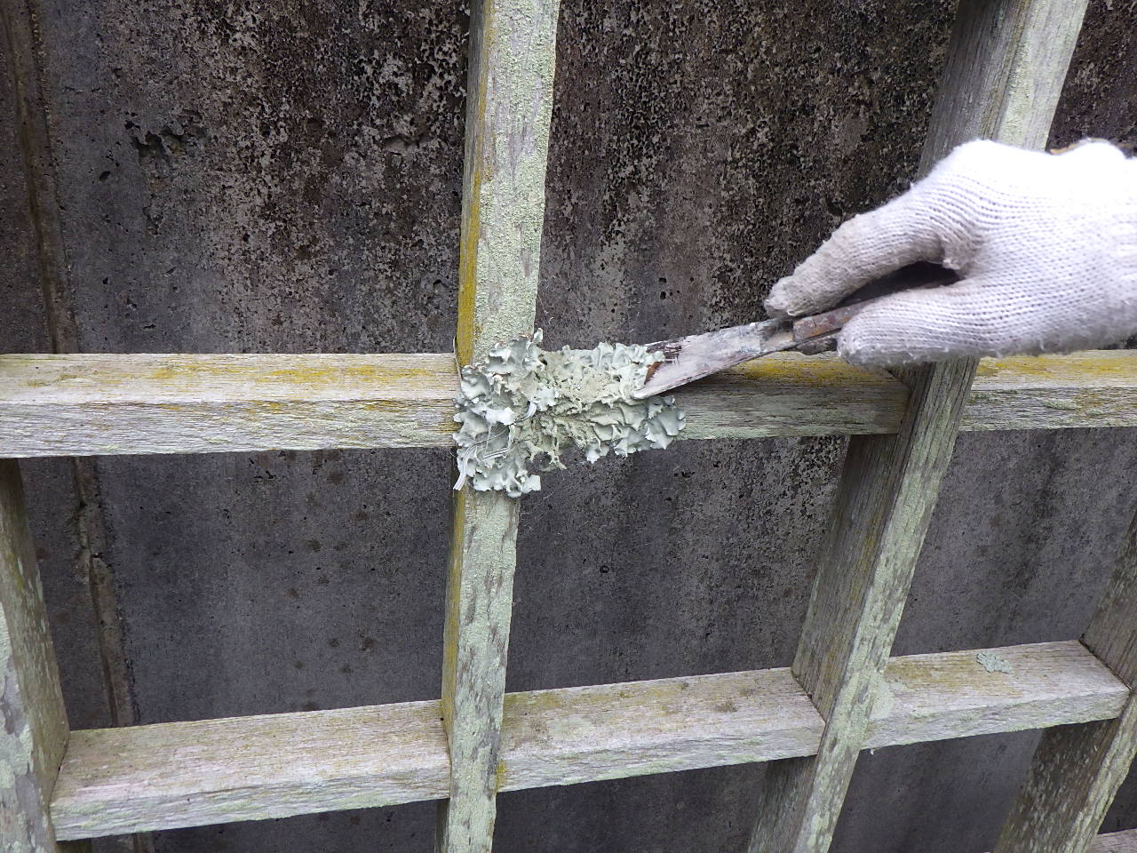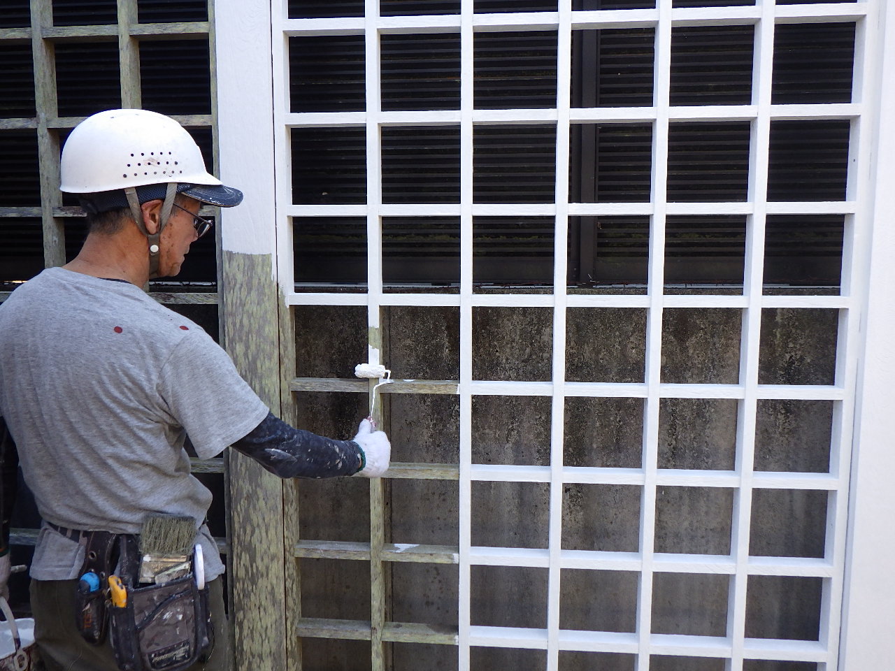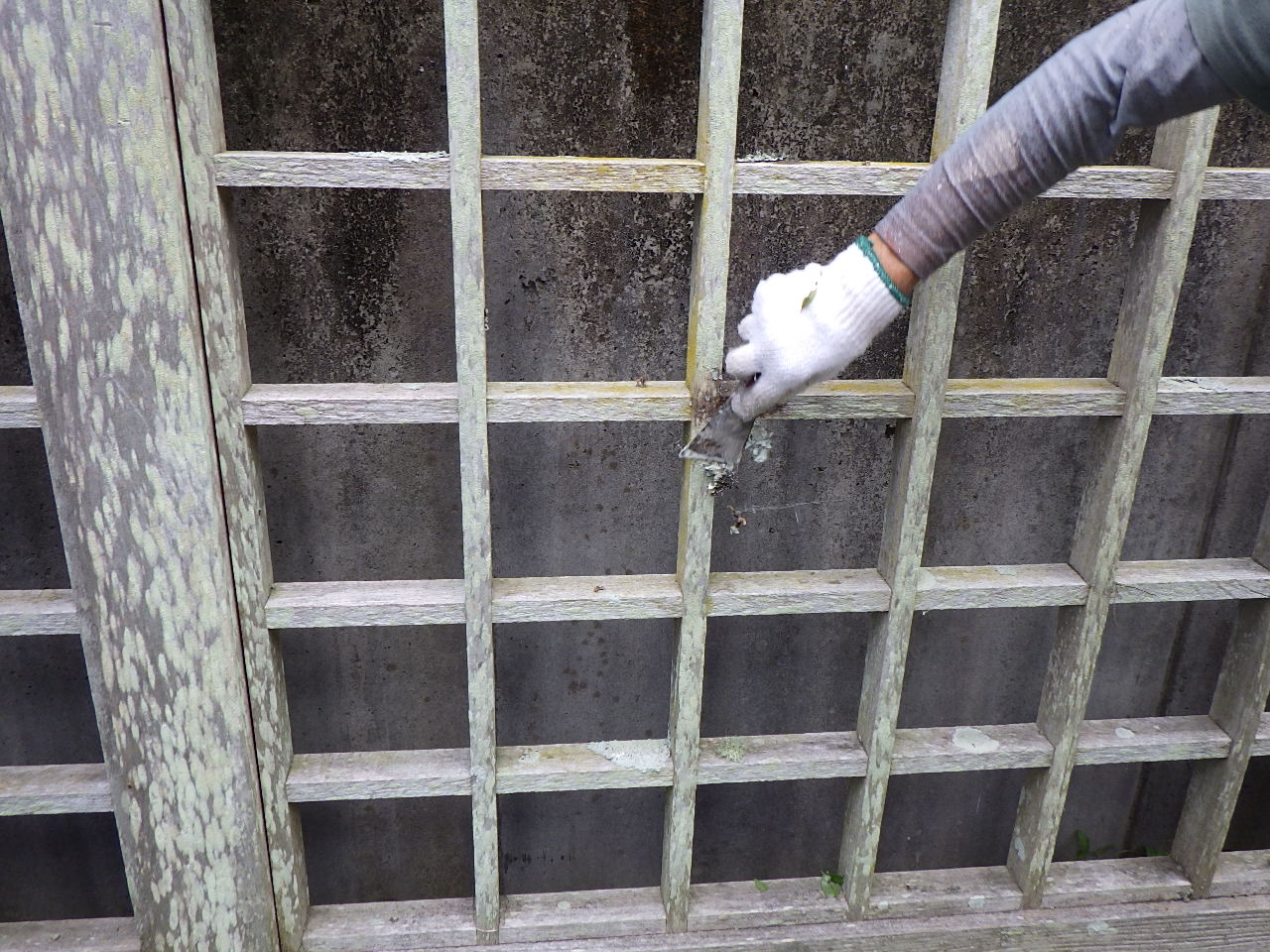 柱や格子部分の塗膜がはがれ、コケの付着も確認できました。 この状態をしっかり補修してから塗装に入ります。